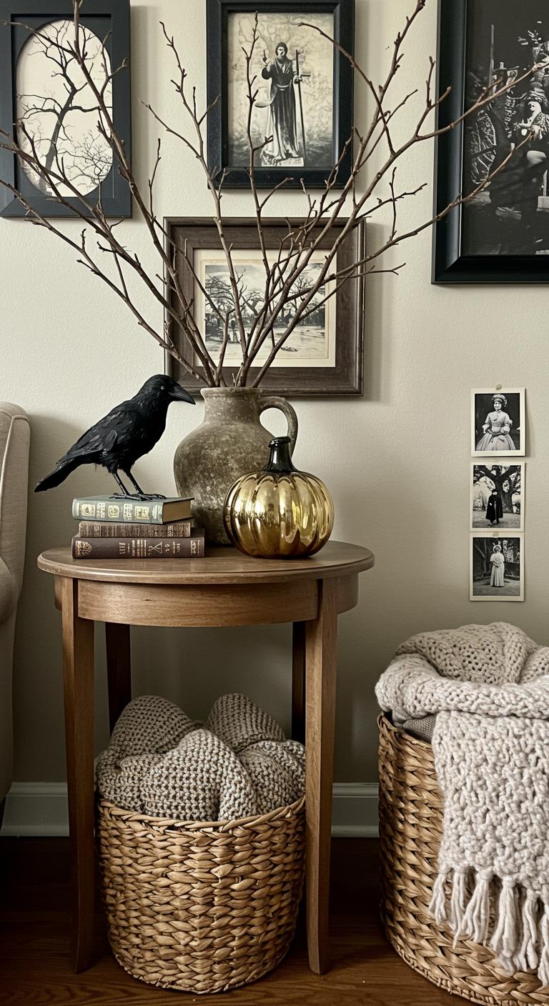 A crow-themed side table can serve as a fascinating addition to any Halloween decor, echoing the enchanting elements found in a well-decorated mantel.