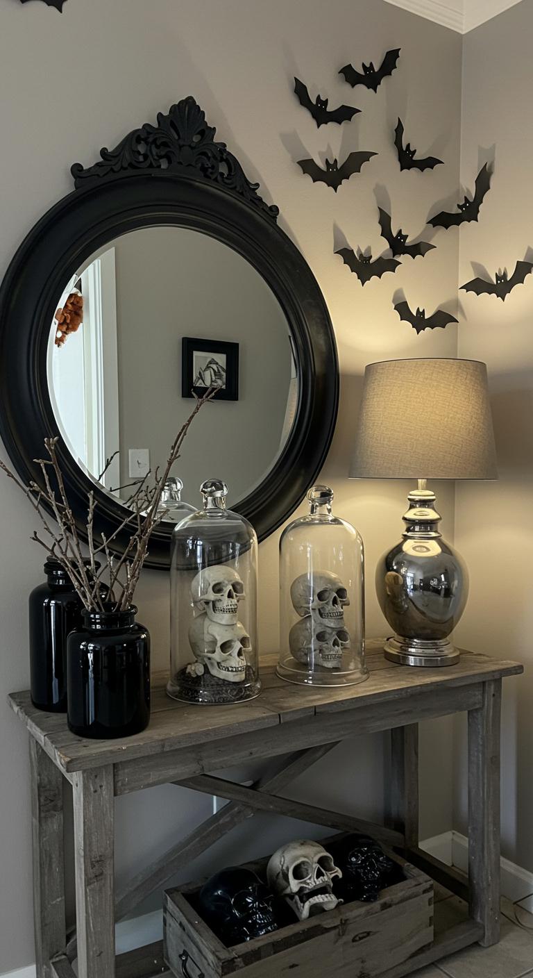 A rustic table adorned with a dark round mirror reflects an enchanting ambiance, while skulls encased in bell jars provide a spooky welcome.
