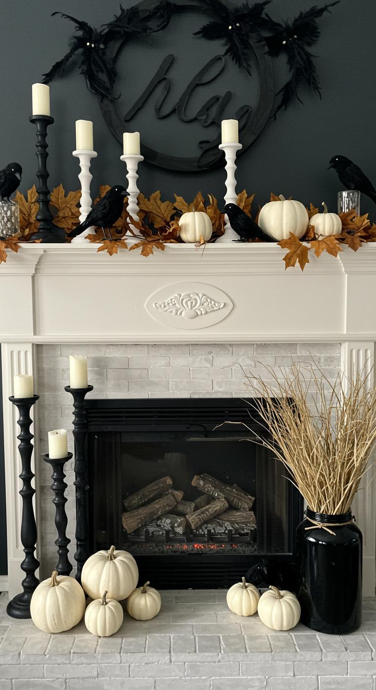 Creating a crow-themed fireplace decor can seamlessly enhance the haunting charm established in an entryway. A white-painted fireplace serves as a striking backdrop, allowing the fireplace mantle arrangement to shine. Black and white candlesticks of varying heights create visual intrigue, while crow figurines placement among them adds a whimsical touch. Complement the scene with white pumpkins and dried leaves, invoking the essence of autumn. A black jar filled with dried grass enhances the natural feel, completing the ensemble. This innovative decor transforms the fireplace into a mesmerizing focal point, perfect for celebrating the mysterious allure of Halloween.