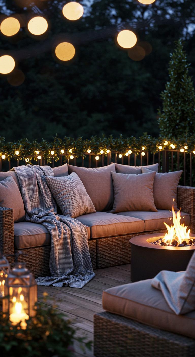 Combine this look with string lights and lanterns to enhance the warm glow. You can even create a comfortable seating arrangement for friends and family to gather.