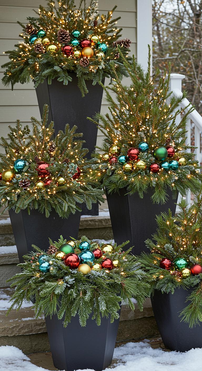 Decorate your outdoor planters for an instant holiday lift! Fill them with pine branches, ornaments, and string lights to create eye-catching displays.