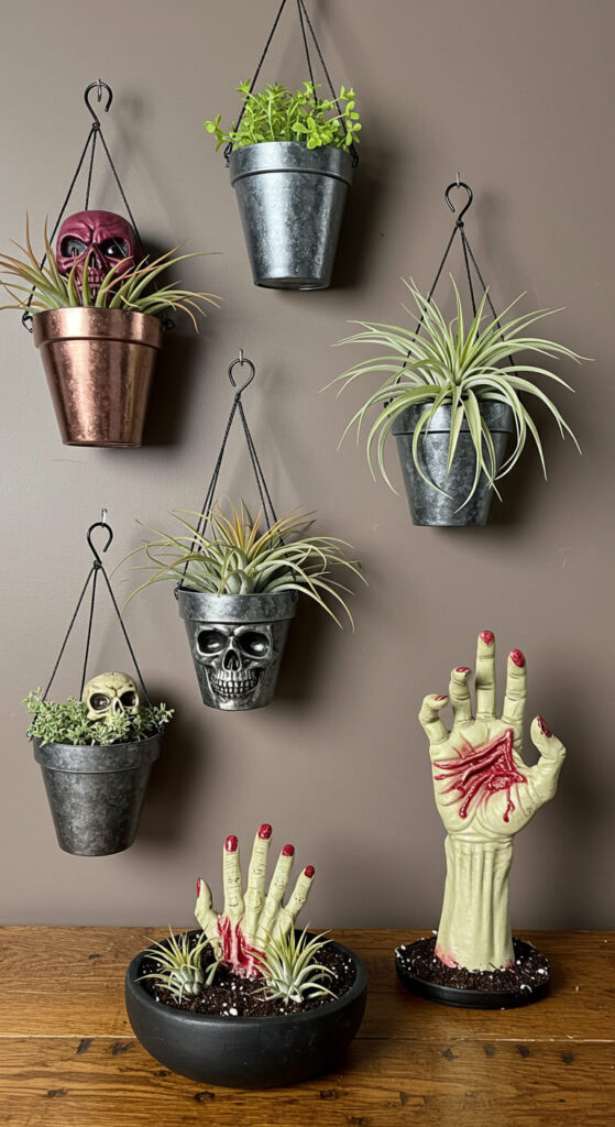 How can one elevate Halloween decor into the domain of artistry? Unique displays and arrangements transform ordinary planters into haunting arrangements that captivate the imagination. The Horror Hall of Hanging Planters features metallic finishes, each embodying a distinct character, while the Skull and Spores Halloween Air Plant Display merges Lovecraftian elements with botanical intrigue. Eerie displays like the Zombie Hand Halloween Planter bring a visceral touch, with gnarled fingers bursting from soil, embodying the essence of Halloween’s spookiness. Such innovative concepts not only enhance the ambiance but also invite onlookers to appreciate the artistry behind these chilling creations.