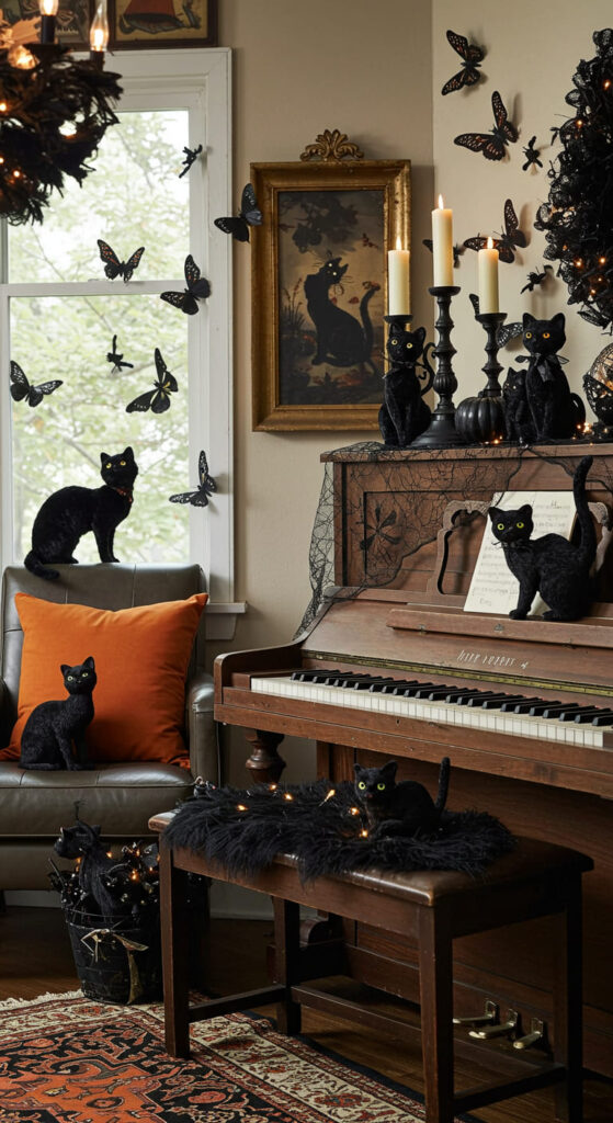 In a vintage living room, the charm of black cats can transform the space into a cozy Halloween haven.