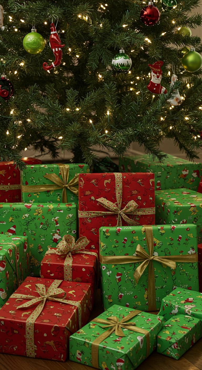 Make your holiday gifts part of the décor! Use Grinch-themed wrapping paper to create an eye-catching display beneath your tree. Simple wrapping paper in festive colors can be enhanced with handmade tags that reflect the tree’s theme. You can even use stickers or stamps of Grinch-themed characters for a fun touch. If you prefer a DIY approach, craft your own wrapping paper with stamps. This small detail harmonizes your decorations and presents, blending gifts beautifully with your festive décor!