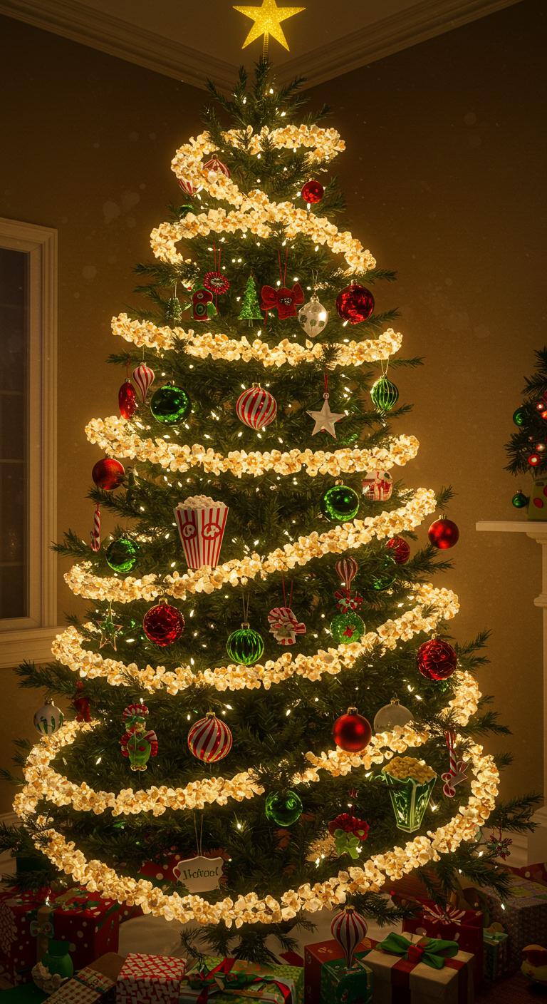 Add a popcorn garland to your tree for a fun and unique look. This DIY project creates nostalgic nostalgic charm, easy to make and cost-effective. Simply pop some popcorn and string them together with a needle and twine. You can dye the popcorn with food coloring for even more festive colors. Placing this garland amidst your other ornaments introduces texture while adding an unexpected twist. It’s a playful and family-friendly project that’ll keep the holiday spirit alive!