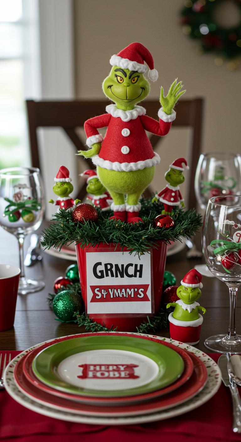Take your Grinch theme beyond the tree and incorporate table centerpieces. Creating a Grinch-inspired centerpiece can enhance the festive mood. Gather small Grinch decorations to create groupings or use a mini tree at the center. Craft supplies like mason jars filled with decorative items work well as affordable options. You can even create place settings themed around the Grinch with personalized touches. This idea keeps the joy of the Grinch within your holiday spirit throughout the entire gathering!