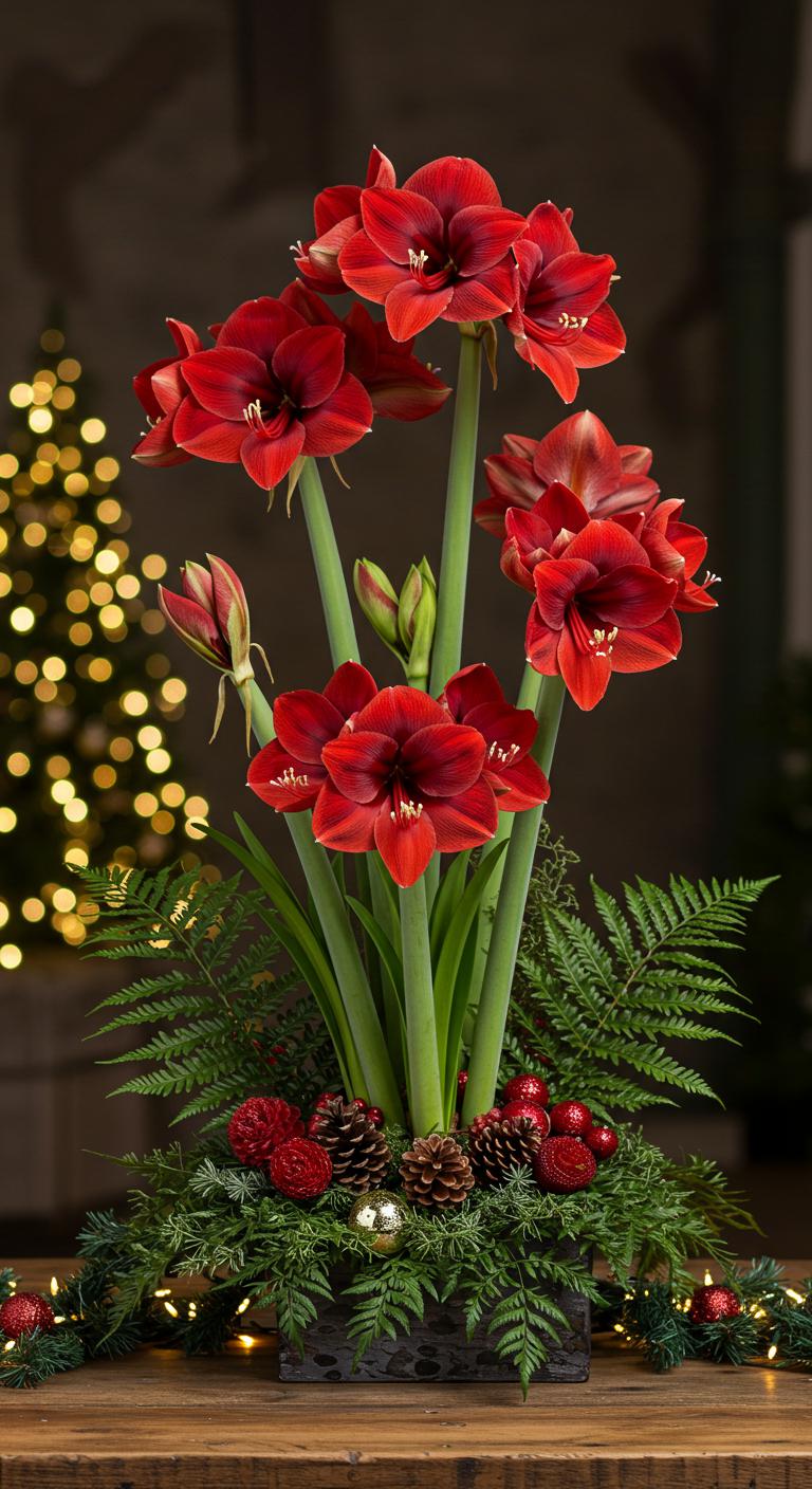 Amaryllis brings an impressive stature to any Christmas arrangement. Their striking bell-shaped flowers draw attention and serve as perfect focal points. Start by selecting a few sturdy stems. Combine them with evergreen foliage for a lush look. You can even add small gold ornaments or cranberries for a festive touch. Place your amaryllis in a tall, elegant vase for a chic display. These flowers are available at florists and grocery stores, making them easy to find. They last a long time, so enjoy their beauty throughout the season.