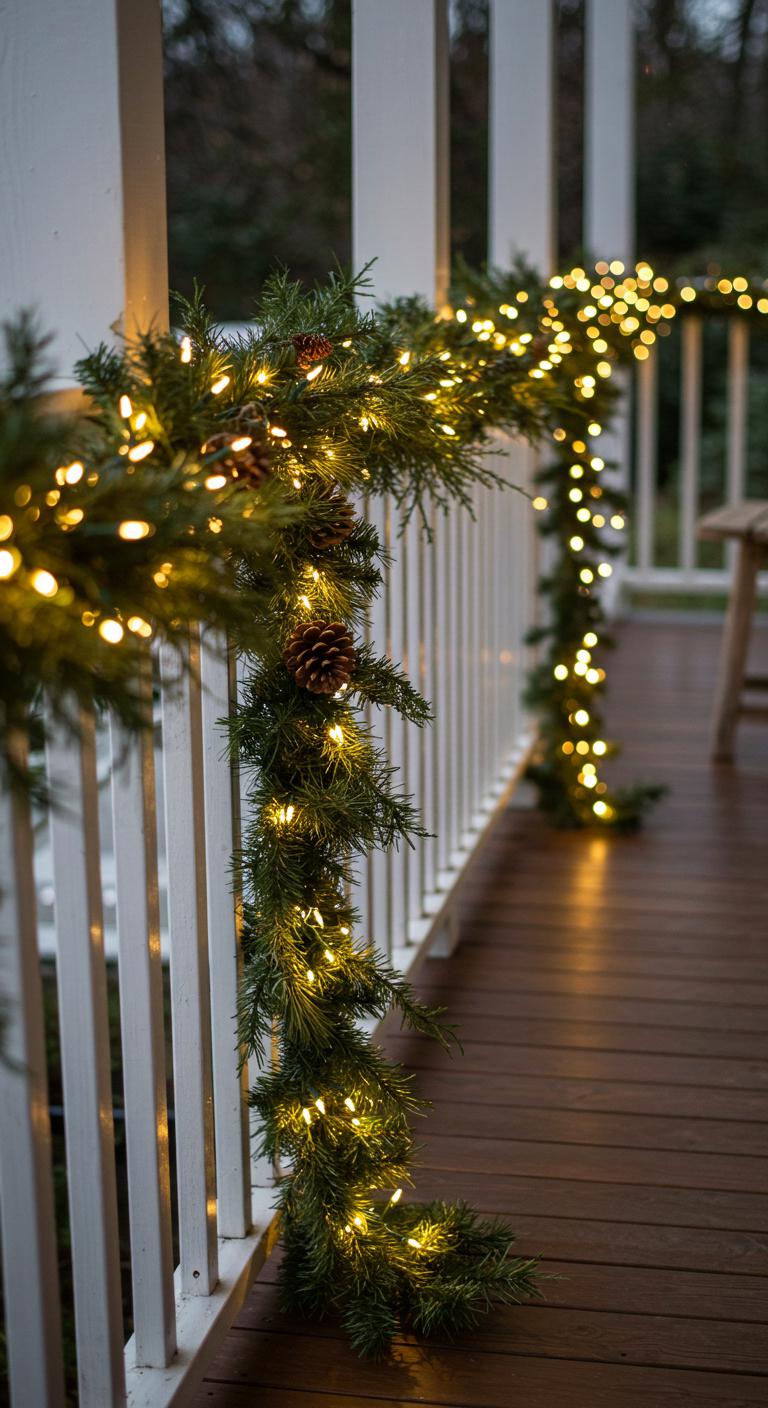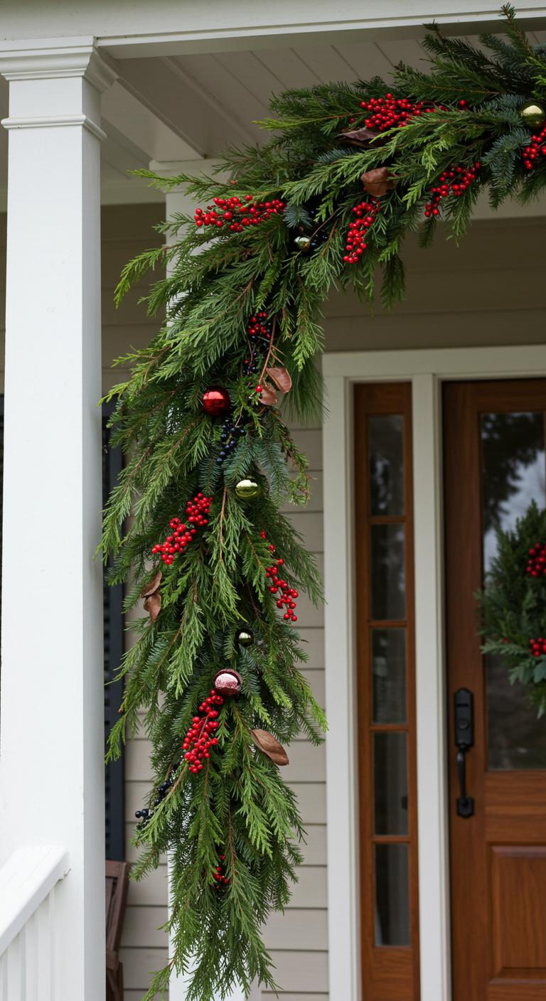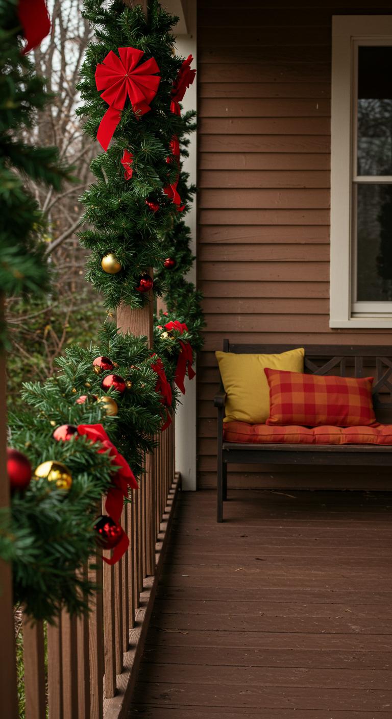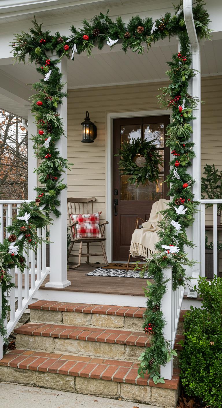 Transform your greenery into something truly festive by adding pops of color. Use red bows, shiny red berries, or colorful ornaments to accent your garland. These touches will draw the eye and create lively focal points on your porch. Simple materials like wrapping paper or craft paper can be used to wrap the ornaments, making them more budget-friendly. Remember, you don’t need to fill every inch with color; consider strategic spots where an ornament or two can make a big impact. You can even involve children in crafting these decorations – it’s merry family fun!
