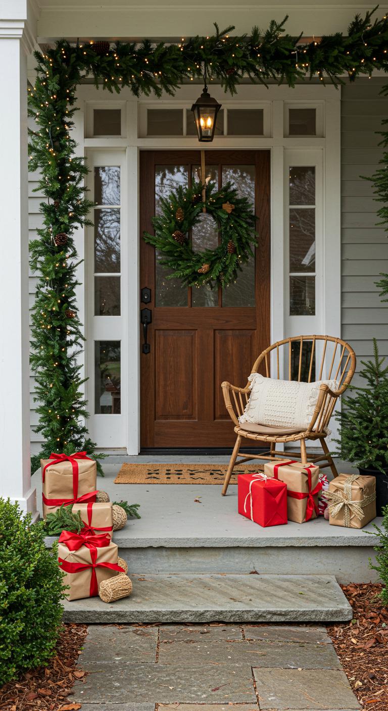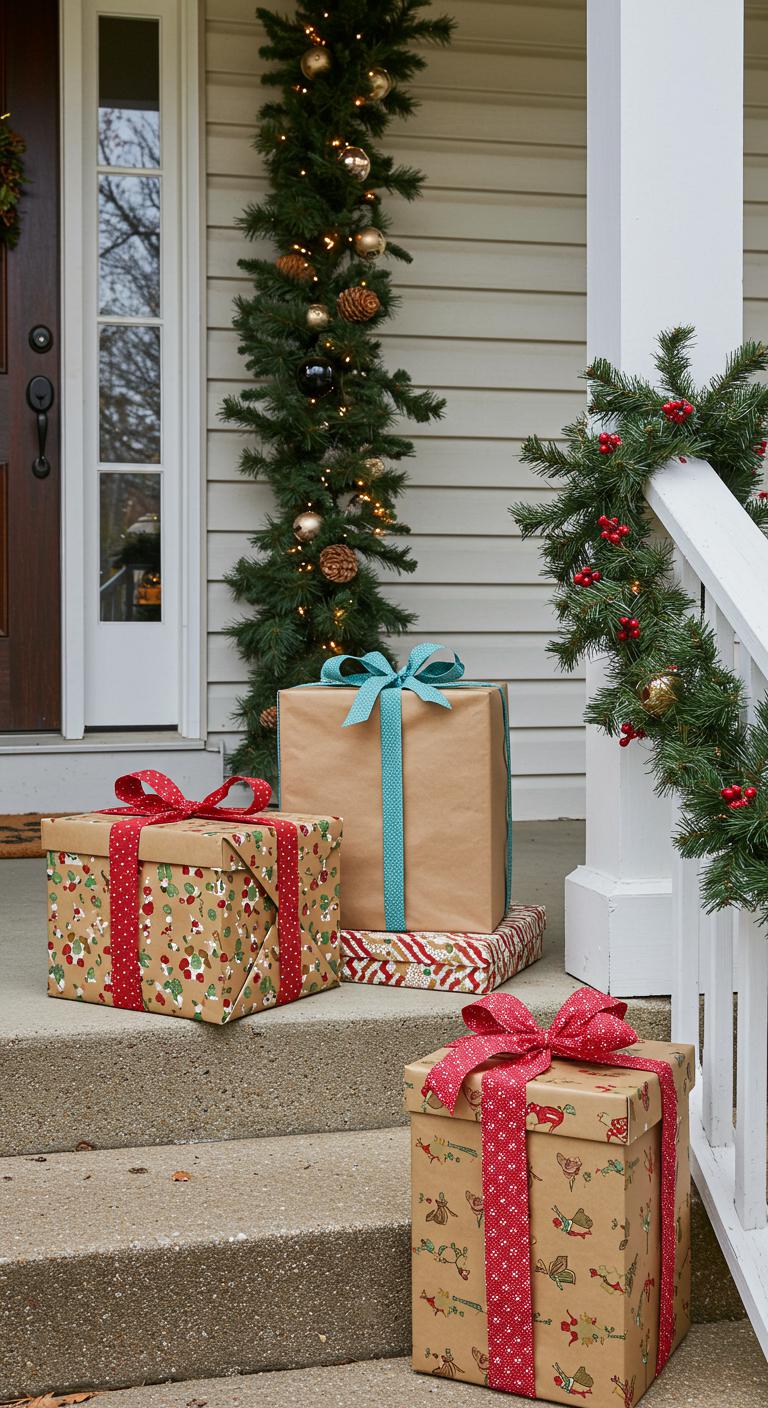 Adding DIY gift boxes to your porch instantly amps up the festive charm. Use empty boxes from previous purchases or recyclables like old shoeboxes. Wrap them in your favorite decorative papers and finish with vibrant bows. Place these cleverly around your entrance or along the porch railing for a playful, inviting look. This low-cost idea requires minimal supplies but makes a charming statement. Plus, they can easily be reused yearly. It’s a simple way to spread holiday joy without taking up much space or breaking your bank.