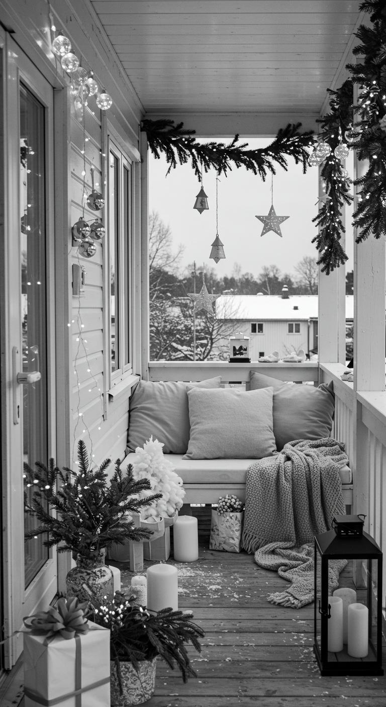 Explore the trend of monochrome and neutral palettes for your holiday decor. Shades of creamy whites, browns, and greens create a sophisticated yet cozy look on your porch. Choose a limited color palette, incorporating natural materials and textures to enhance visual interest. Small touches like white candles in glass holders or beige cushions can make your space feel inviting. The beauty of this approach is that it’s versatile and can often be put together with items already in your home. This neutral motif is calming and stylish, perfect for small spaces.