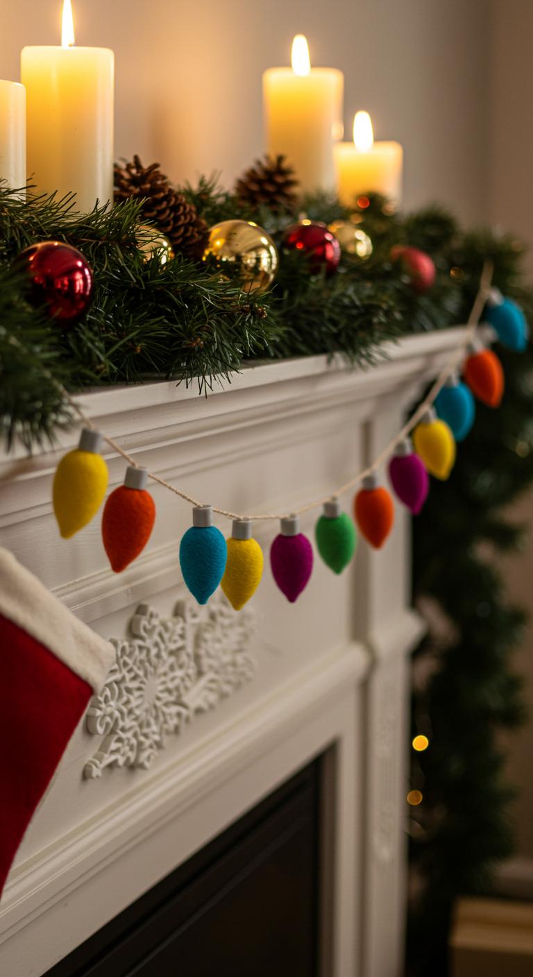 Transform felt into holiday lights for a cheerful display. Cut out light bulb shapes from various colored felt. Stitch or glue them onto a long piece of ribbon. Each felt piece adds a pop of color. You can hang this garland around the tree, mantle, or windows. It serves as an economical decoration for creating a festive atmosphere. Plus, it’s a fun project to share with family!