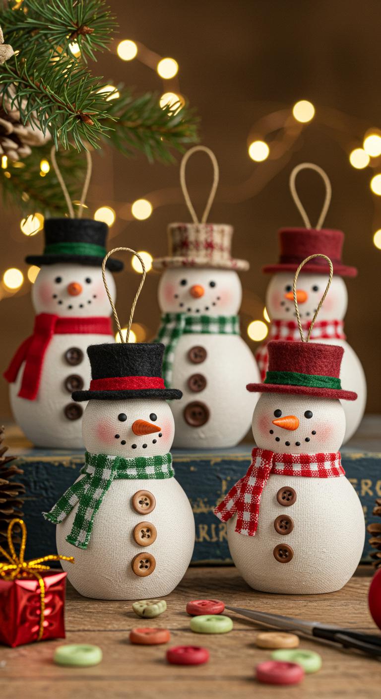 Make rustic button snowmen for a touch of cozy charm. Use wooden buttons for the base, stacking them to form snowmen. Add fabric scraps for hats and scarves. A bit of glue holds it all together while enhancing the rustic vibe. These sweet little ornaments are simple yet make an impact. They are perfect projects for kids because they involve exploring their creativity with buttons!