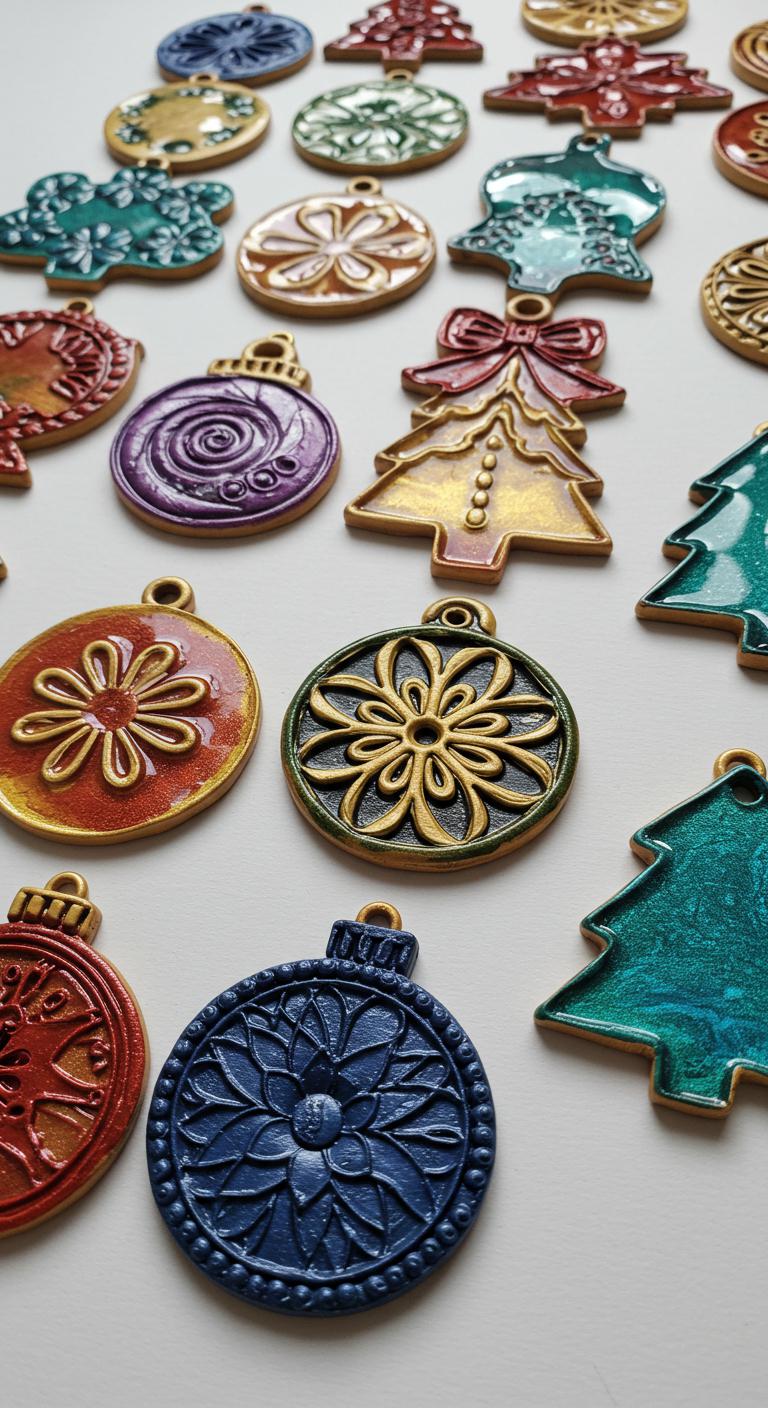 Dip your clay ornaments in resin to achieve a magical look. First, craft your shapes from polymer clay and bake them. Let them cool completely. Next, mix your resin as per the instructions, coating the surface of your ornaments for a glossy finish. This elevates simples designs with a professional touch. Although resin is a bit more costly, the end results are impressive.