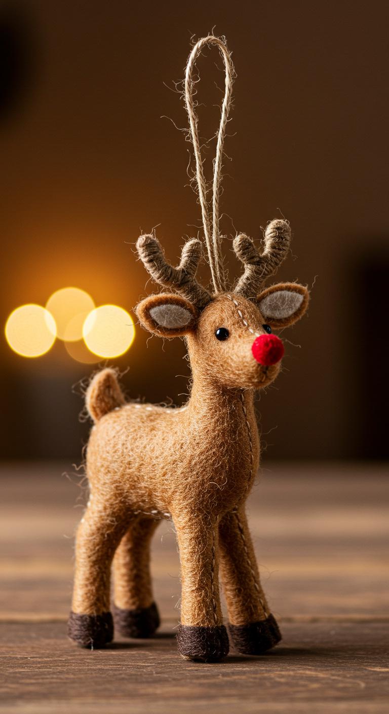Create your very own felt reindeer. Start by choosing brown felt for the body. Cut out the basic reindeer shape and additional pieces for antlers and a red nose. Slightly layer the pieces for dimension and glue them in place. Use embroidery thread for detailing around the edges. Hang them on trees, or personalize them as thoughtful gifts. These reindeer are charming and only require minimal supplies and crafting time.
