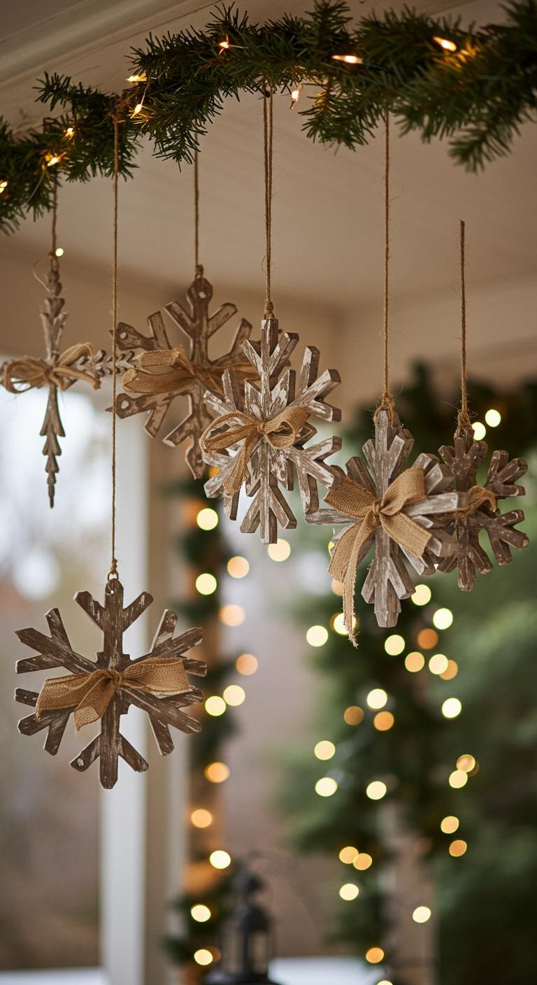 Make your own wooden snowflakes for a cozy touch. Use reclaimed wood or pallets to create various shapes. Cut them into snowflake designs and apply a light coat of white paint for a frosty look. Hang them from the porch ceiling, railings, or walls. It’s a fun afternoon project! To save costs, hunt for free wood from construction sites or local trades. This DIY is simple yet effective for wintery charm.