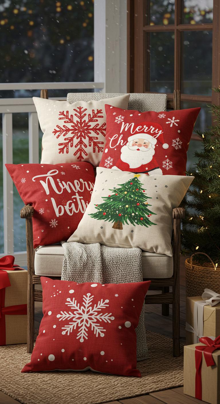 Take advantage of themed pillows to complement your holiday decor. Choose pillows with fun designs that reflect Christmas cheer. Create your own covers using festive fabric and sewing skills. These add comfort and style, inviting visitors to sit and enjoy your porch. You can easily swap these seasonal accessories or use removable covers for year-round versatility.