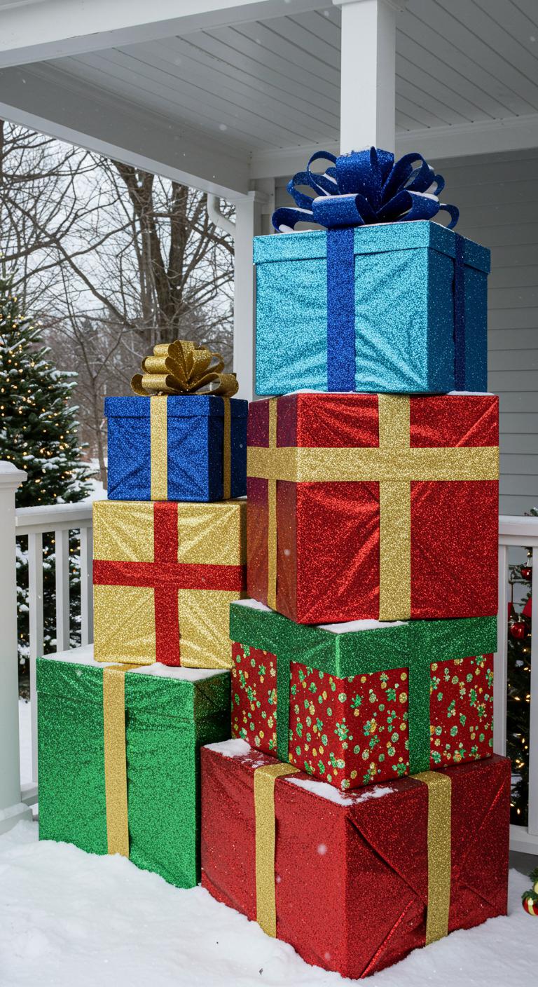 Create wrapped present stacks as charming decorations. Use cardboard boxes of various sizes, wrap them in bright wrapping paper, and add bows on top. Stack them near your door for an inviting look. This project only requires some old boxes, making it a budget-friendly option. The sparkle of the presents draws the eye while signaling the festive season.