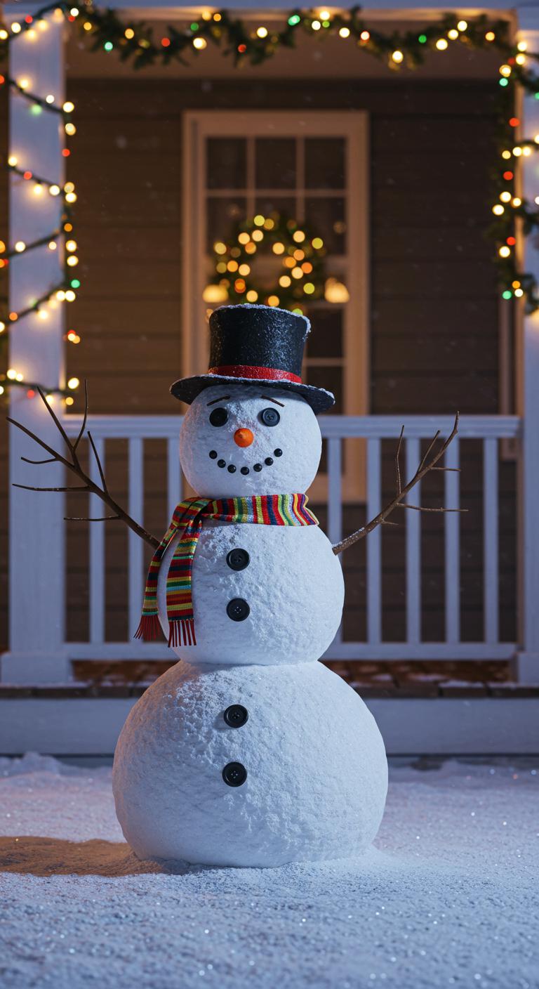 Build a holiday snowman as organic decor. If snow allows, stack it high and decorate with personal touches—scarves, hats, and button eyes make it fun! If snow isn’t available, create one from white fabric and fill it with soft materials for a lightweight option. Set it up next to your porch for a cheerful winter greeting. Kids can also get involved in creating fun features.
