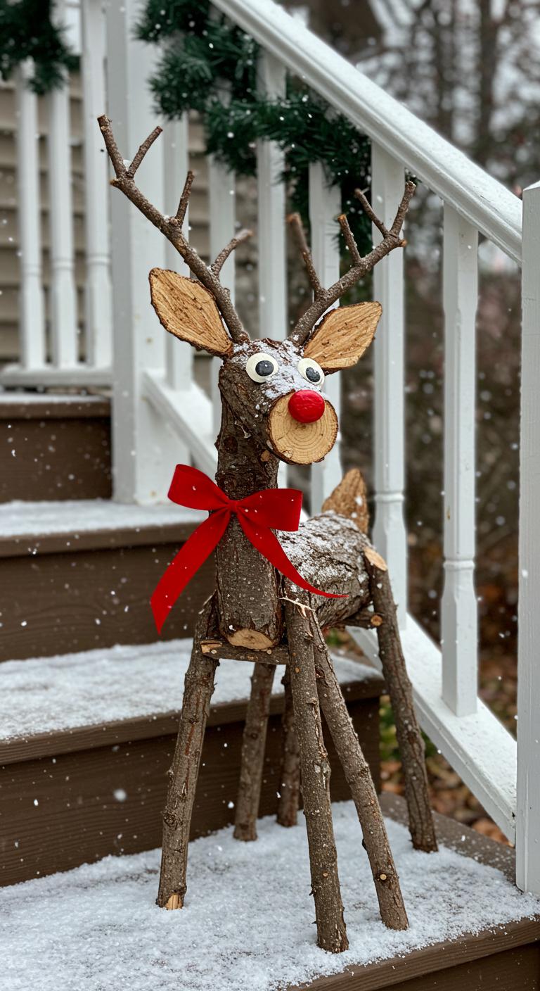 Create your own log reindeer to bring whimsy to your porch. Collect logs of various sizes and stack them to form a reindeer shape. Use small branches for antlers and rocks for eyes. Paint stripes for character or add a scarf. This project leverages natural materials and adds rustic charm to your space. Place it next to the porch steps for a welcoming holiday image.