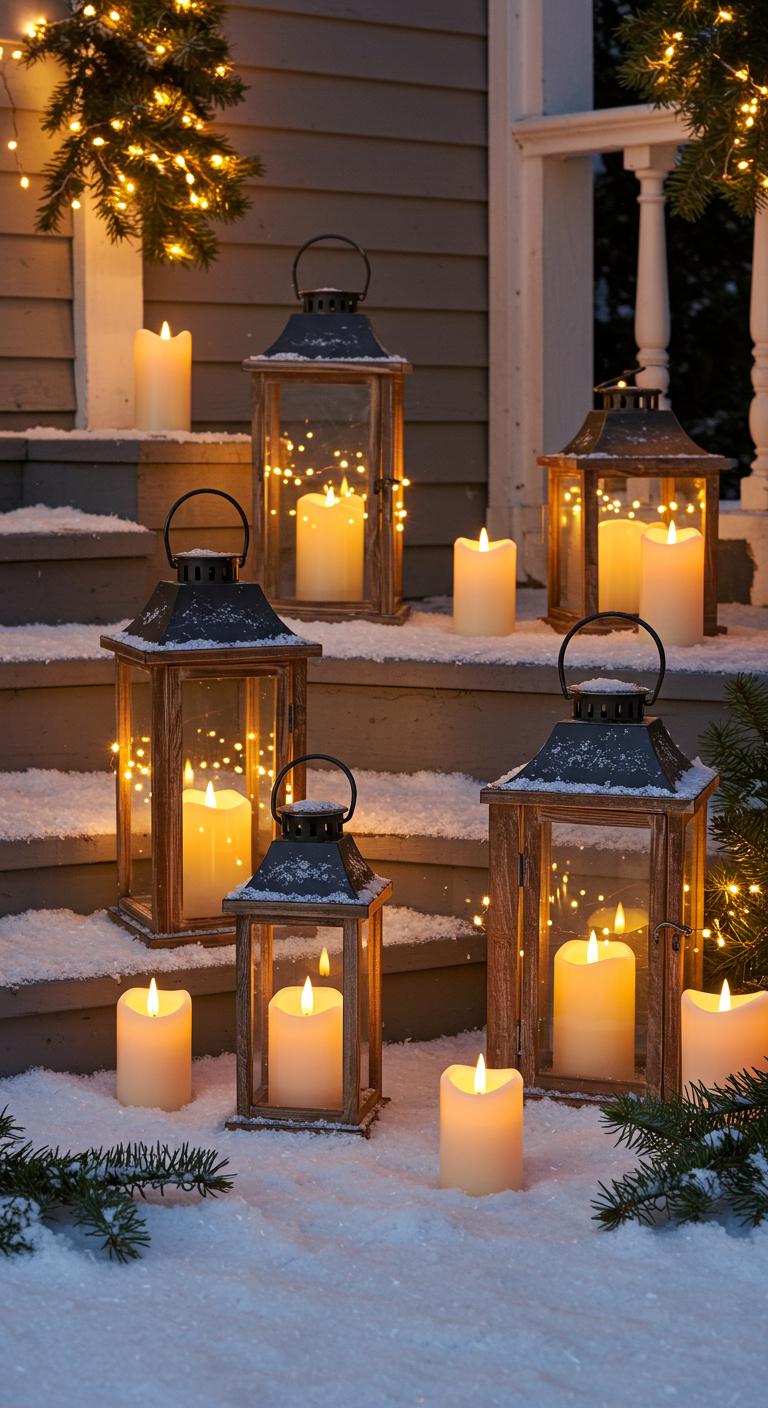 Incorporate lanterns for a festive look. Use rustic or vintage lanterns and fill them with flameless candles for safety. Arrange them in clusters or line the steps. This cost-effective decor elevates the holiday spirit, providing soft, inviting light. Mix sizes for dimension and use natural elements, like pinecones or ornaments, inside the lanterns for extra flair. It’s a straightforward craft you can assemble in an evening.