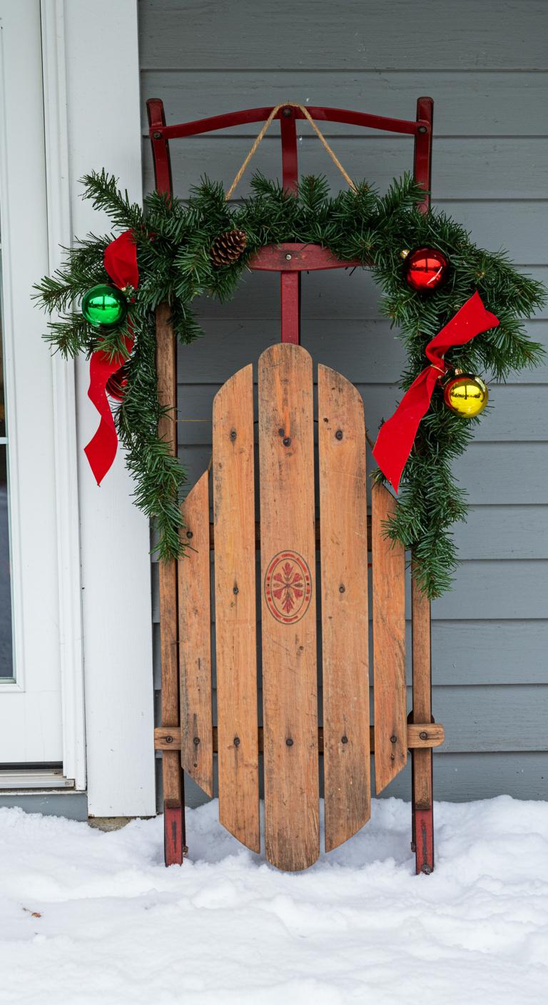 Repurpose old sleds as festive decor. Place them near your porch entrance, and enhance their appearance with small holiday accents, like evergreens and bows. You can spray paint sleds in your preferred colors, adding a personal touch. This eye-catching decor can be found at thrift stores or garage sales, making it a delightful, budget-friendly project. It ties in beautifully with all your rustic themes.