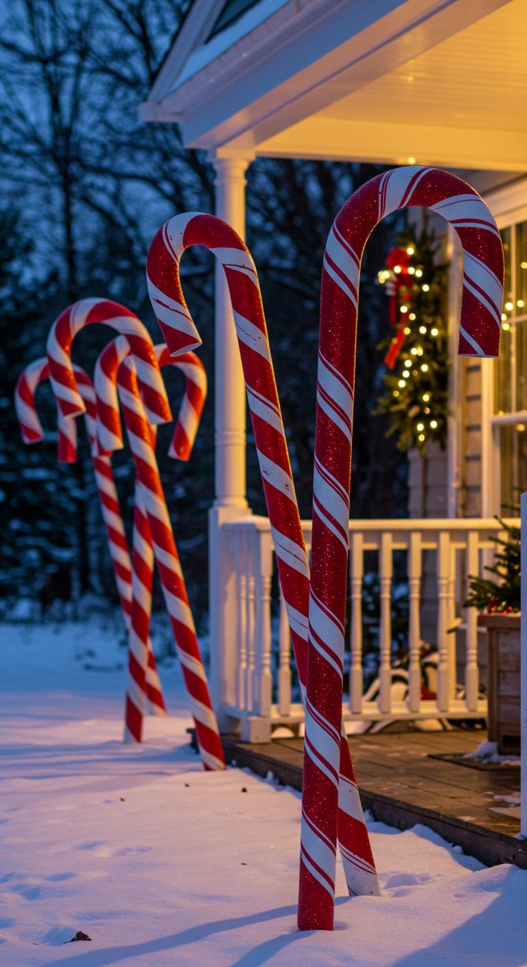 Construct giant candy canes for a fun, festive touch. Use PVC pipes to create the structure, then wrap them with red and white fabric or painted tape for the classic look. Secure them in your yard as eye-catching displays. It’s a larger project but can be completed within a few hours. The materials are affordable, especially for crafty families looking to add more cheer to their holiday decor.