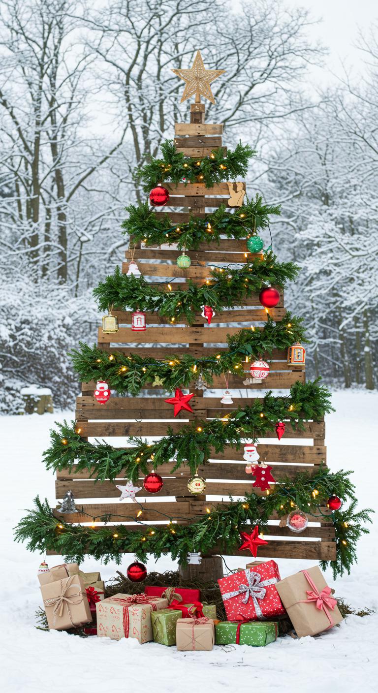 Create your own pallet wood Christmas tree with just a few tools. Source free pallets from local businesses and cut them into the shape of a tree. Sand down any rough edges to keep it safe for little hands. Next, paint the tree in your favorite holiday colors or stick to a natural wood finish for that rustic vibe. Attach LED string lights for nighttime sparkle, and hang handmade ornaments for personalization. These trees stand proudly in yards and gardens, making no two alike, while providing a charming focal point through the holidays.
