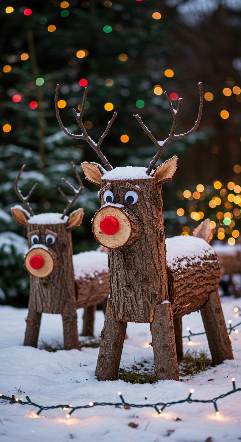 Bring the forest to your garden with log reindeer! Gather sturdy logs, preferably varying sizes for a family of reindeer. Start by cutting a log for the body and smaller pieces for the legs. Simple twigs form antlers. Paint the face with a cheerful expression and add a red nose to give it a seasonal look. Use natural wood stain or leave it untreated for an organic feel. Place these reindeer scattered throughout your yard for a bit of holiday magic.