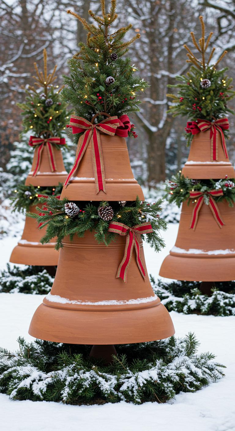 Make oversized Christmas bells using garden pots! Stack large pots upside down to form a bell shape. Use spray paint in classic holiday colors to create your festive look. Attach holiday ribbons around the tops to mimic a bell clapper. You can place these large decorations in prominent spots in your garden or group them together for a spectacular display.