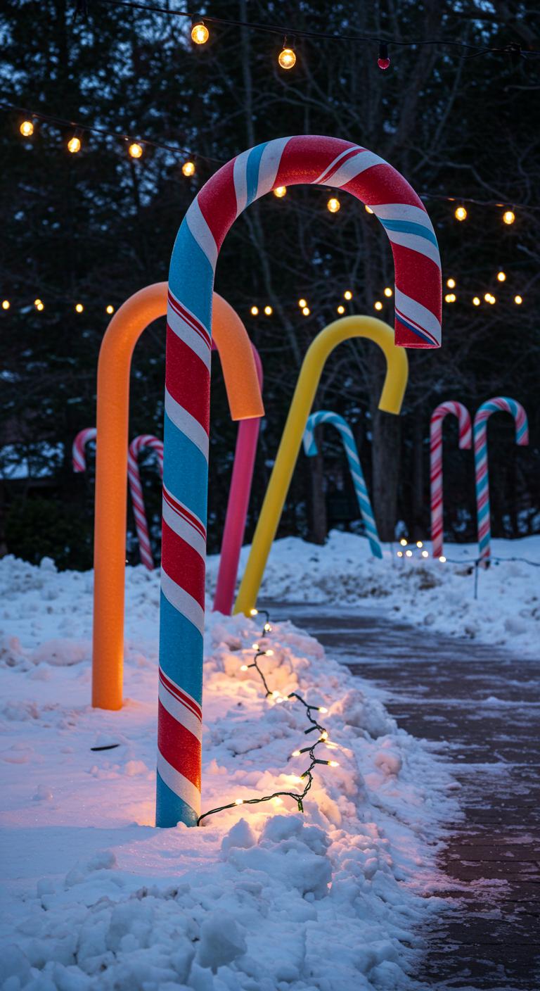You can make giant candy canes using inexpensive pool noodles! Cut the noodles into various lengths to create a range of sizes. Shape the pieces into a candy cane form and secure them with duct tape. Use red and white spray paint to mimic the classic candy cane stripes. For an extra touch, wrap some LED lights around them. Place these delightful decorations next to your front door or along walkways to guide guests into your festive setting.