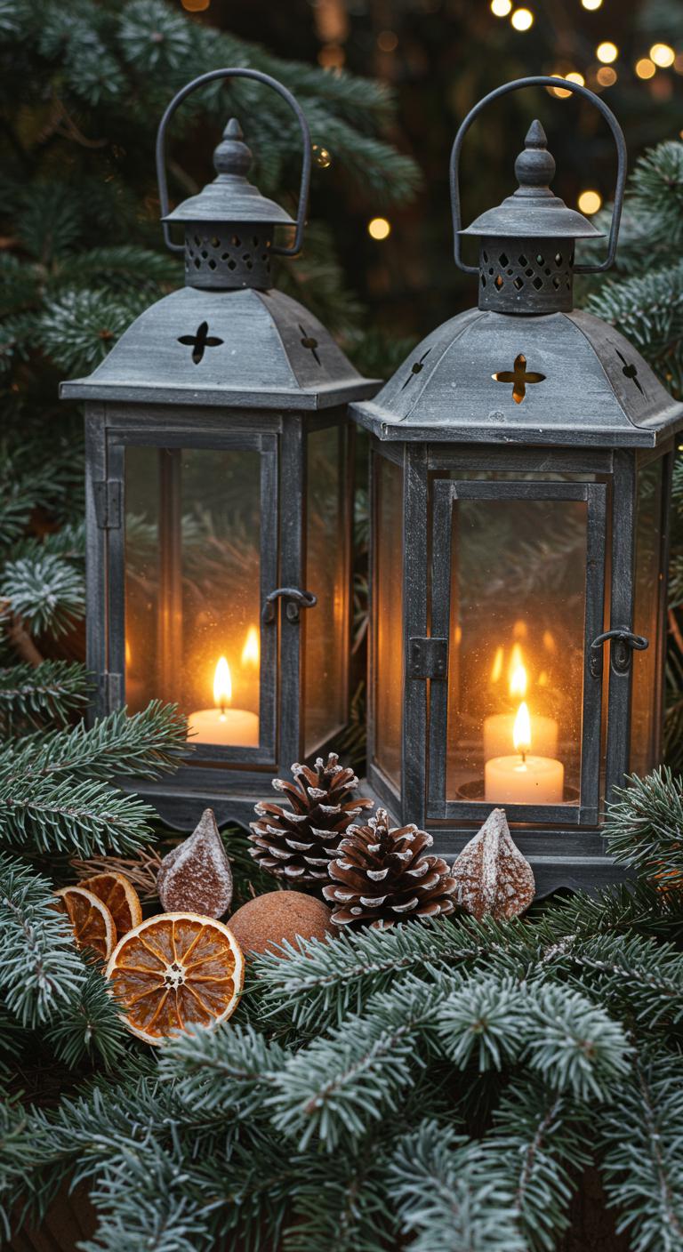 Transform inexpensive lanterns into weatherproof decorations. Purchase some basic lanterns from a craft store or an online retailer. You can also use mason jars or repurpose old metal lanterns. Fill them with pinecones, holly, or even strings of LED fairy lights. To protect against winter elements, apply a weather-resistant spray. Hang these lanterns along your porch or pathways to cast a warm and inviting glow in the evenings.