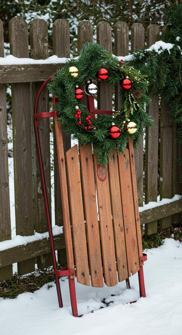 Get creative with a vintage sled display! If you have an old sled gathering dust, put it to work this holiday season. Prop it against a garden fence or near your porch. Decorate it with evergreen boughs, a festive bow, and ornaments. Add fairy lights for extra sparkle during winter evenings. This nostalgic décor piece is easy to set up and makes a stunning holiday statement.