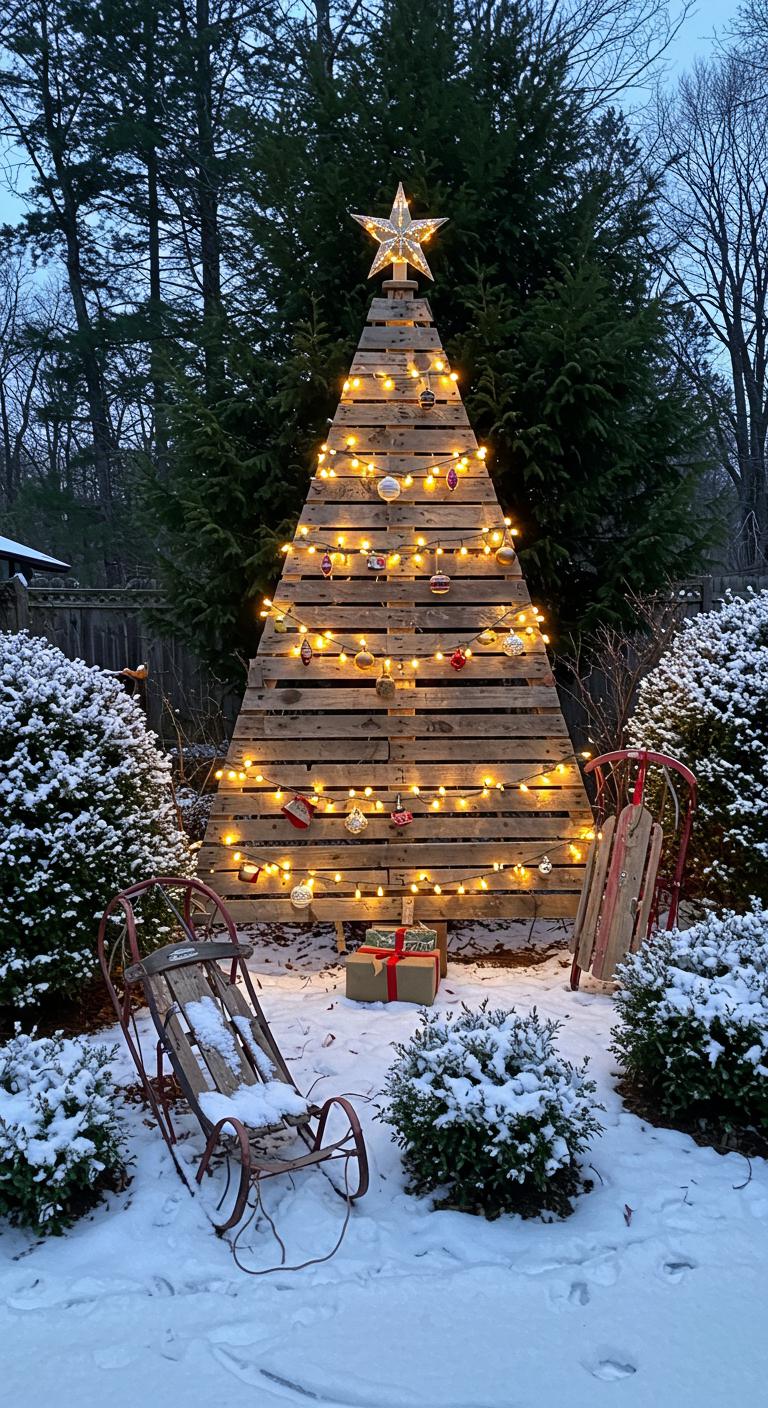 Crafting a Christmas tree from reclaimed pallet wood adds a rustic charm to your yard. You only need a few pallets, some nails, and basic tools. Dismantle the pallets and cut the wood into triangle shapes for a simple tree silhouette. Assemble the pieces, securing them with nails. Now, paint it in festive colors or leave it natural for a rustic look. For added flair, hang some inexpensive ornaments or wrap string lights around it. This project can be made for under $50, making it a budget-friendly choice.