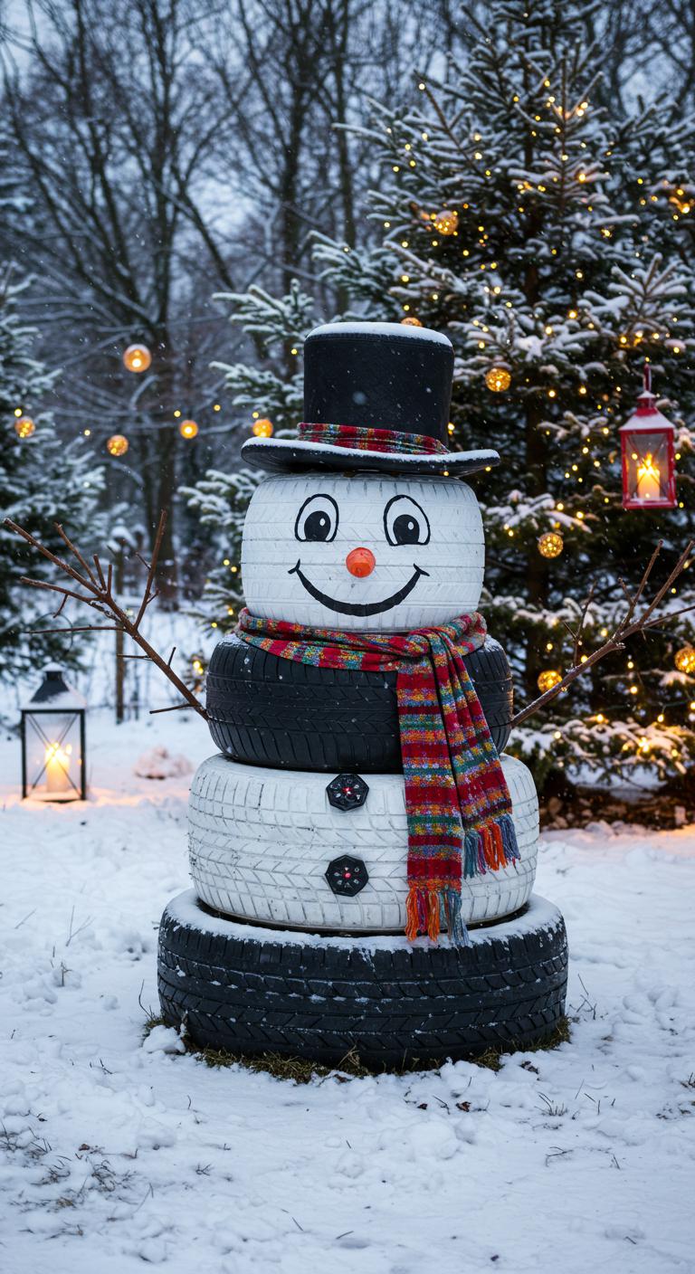 Transforming old tires into a snowman is an eco-friendly way to spread holiday cheer. Stack three tires of varying sizes, painting them white or letting them show their natural color for a unique look. Use spray paint to attach eyes, a nose, and mouth. Craft a scarf from an old sweater and a hat from cardboard or a flower pot. This DIY snowman is charming and budget-conscious, costing less than $30 when materials are sourced creatively.