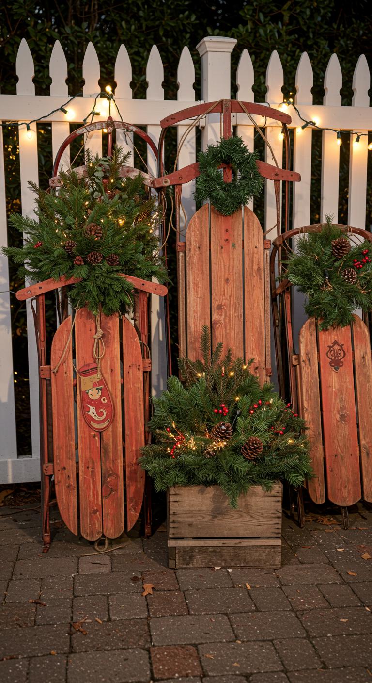 Use vintage sleds to create engaging displays in your yard. Arrange sleds as decorative stands for plants or holidays’ gift baskets. Fill them with holiday greens, bright ornaments, candles, or fun accents. You can often find old sleds at yard sales or thrift shops for under $30, making this a fun, low-cost project. This nostalgic decor enhances the festive atmosphere while celebrating winter activities.