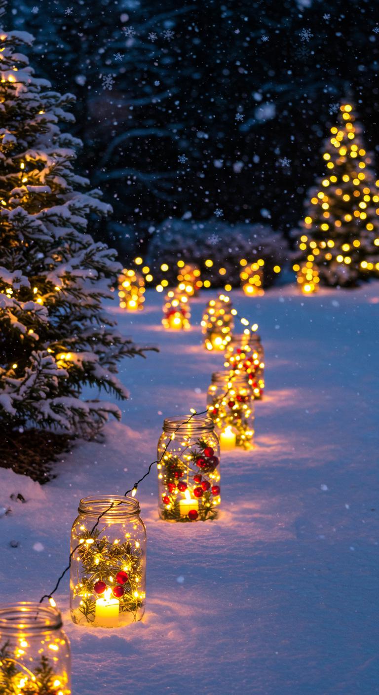 Guide guests to your home with a brightly lit Christmas pathway. Use mason jars filled with Epsom salts for a snowy effect and place LED tea lights inside for illumination. Set these jars along your pathway or driveway. Another idea is to wrap small trees or bushes with fairy lights for a twinkling finish. This project is easy on the budget, with most materials costing less than $30, and can be set up quickly in an afternoon.
