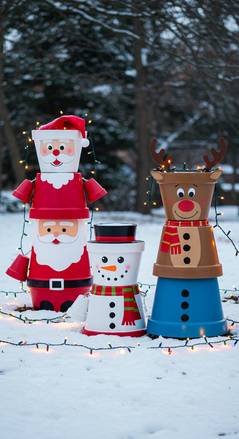 Turn your old garden pots into fun Christmas characters! Simply stack or arrange them creatively to resemble a snowman, Santa, or even a dancing elf. Paint the pots in festive colors and use accessories like scarves, hats, and eyes to give them personality. Place them around your yard for a pop of color against the white snow. This artistic project is inexpensive, with costs under $50, perfect for those crafty families.