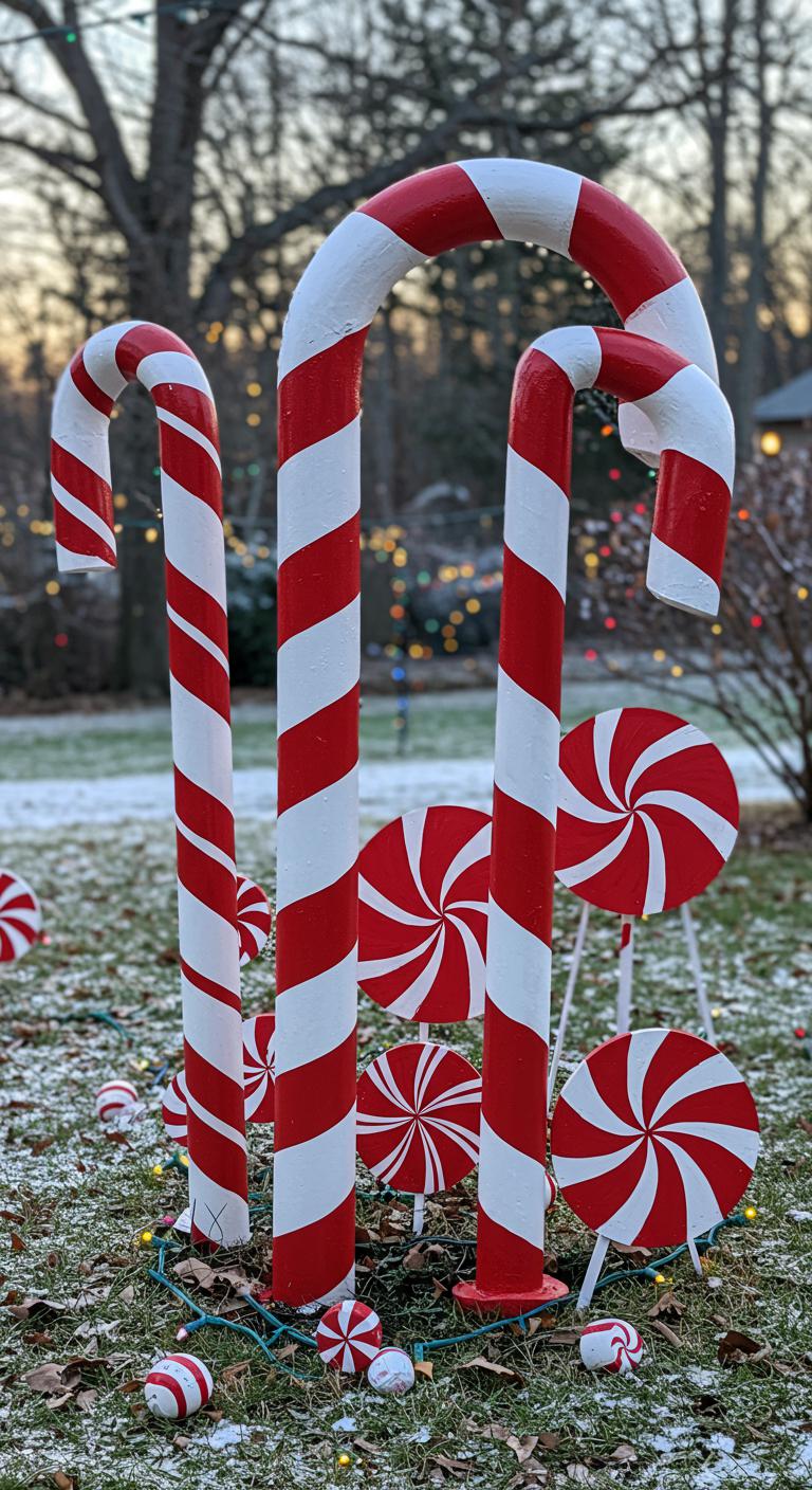 Crafting DIY candy canes is a playful way to capture the essence of Christmas. Use PVC pipes shaped into candy canes and paint them with festive red and white stripes. Another easy project is to make peppermint cutouts from plywood, painting them in fun colors. Place these decorations around your front yard or along walkways for a cheerful touch. This project is simple and costs about $25, making it an easy addition to your holiday decor.