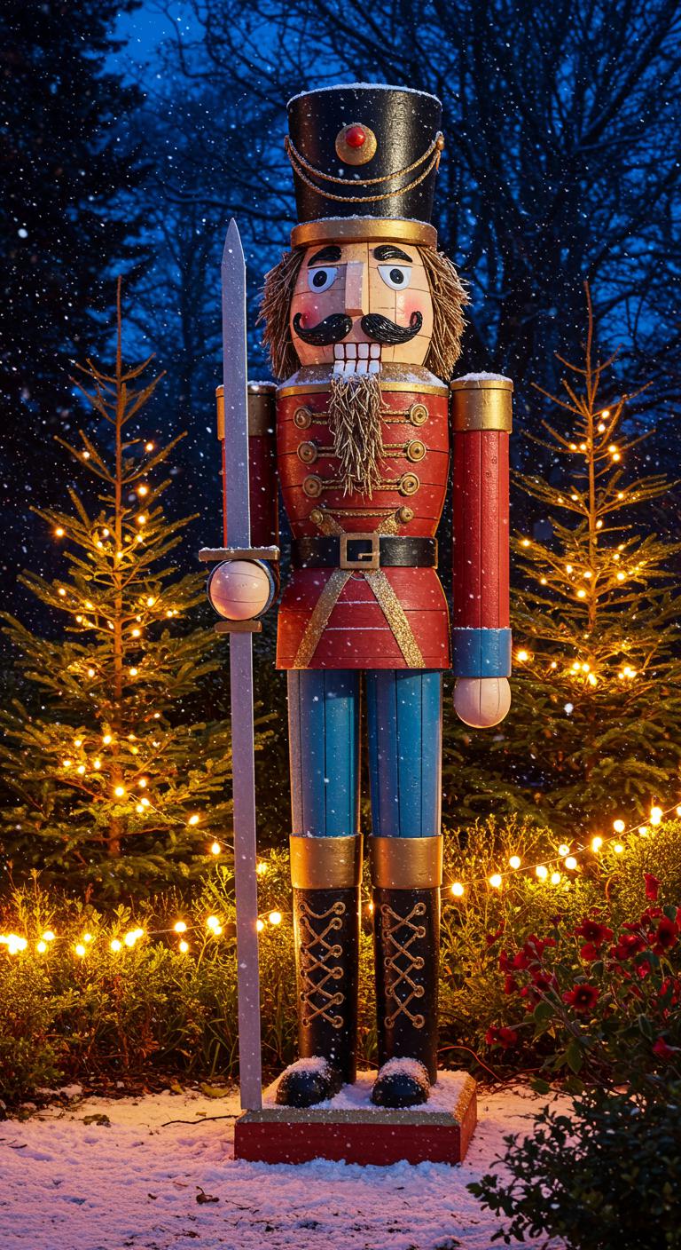 Bring the charm of a nutcracker to your yard using recycled wood. Cut pieces of wood into simple shapes to assemble the nutcracker’s body, arms, and legs. Paint it with festive colors to capture the traditional nutcracker look, and don’t forget to add details like a painted sword. This striking figure can be crafted for approximately $50, providing a classic holiday focal point to your outdoor space.