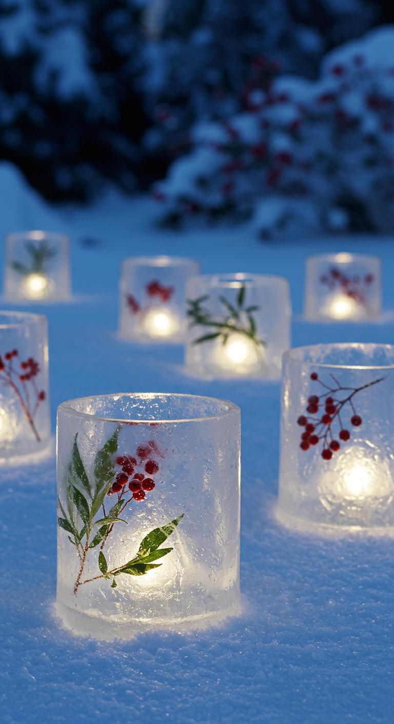 Crafting ice lanterns brings a touch of whimsy to your yard. Fill a container with water and add elements like berries or leaves. Freeze overnight and then carefully remove the ice. Place a tea light inside for a warm glow. These lanterns are enchanting and cost-effective, averaging about $10 per lantern. Align them along walkways or around the front porch for delightful winter decor.