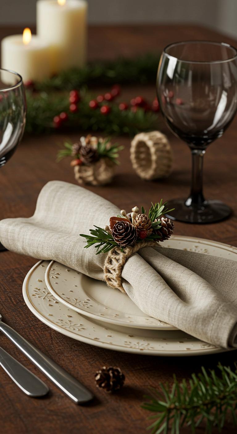 Handmade napkin rings add charm to any holiday table. Use natural materials like twine and embellish them with small items like pinecones or dried flowers. Cut twine into appropriate lengths, and wrap them around napkins creating simple loops. For added personalization, you can add the recipient’s initials. These practical creations enhance any dining experience during gatherings. Plus, they can be reused for other occasions throughout the year.