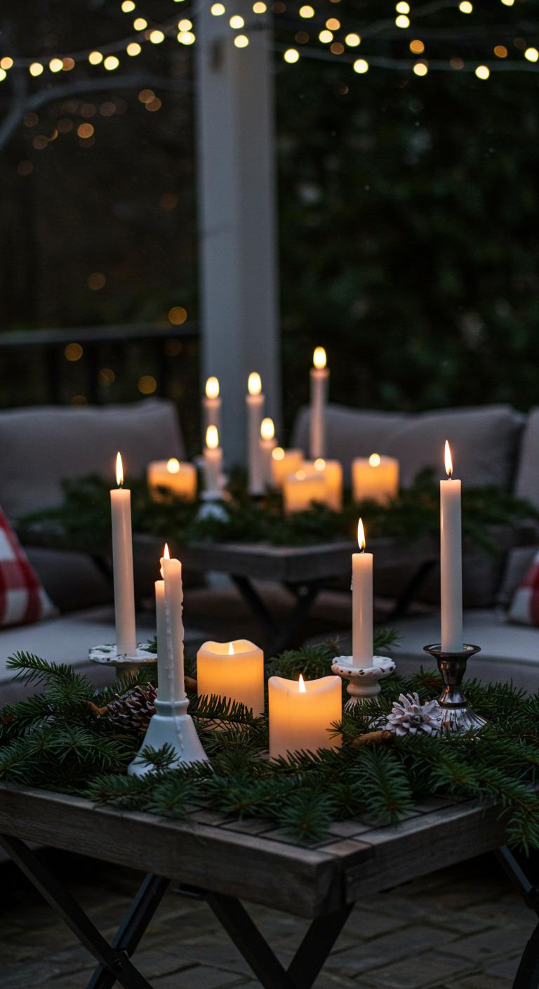 Candle displays can create a peaceful, inviting atmosphere outside. Use varied heights of candlesticks amidst greenery for visual interest. For a seasonal twist, opt for scented candles that evoke holiday feelings. To DIY, place candles in mason jars covered with twine and pinecone accents. These easy additions create charm without excessive expense. Lighting them in the evening sets a magical mood.