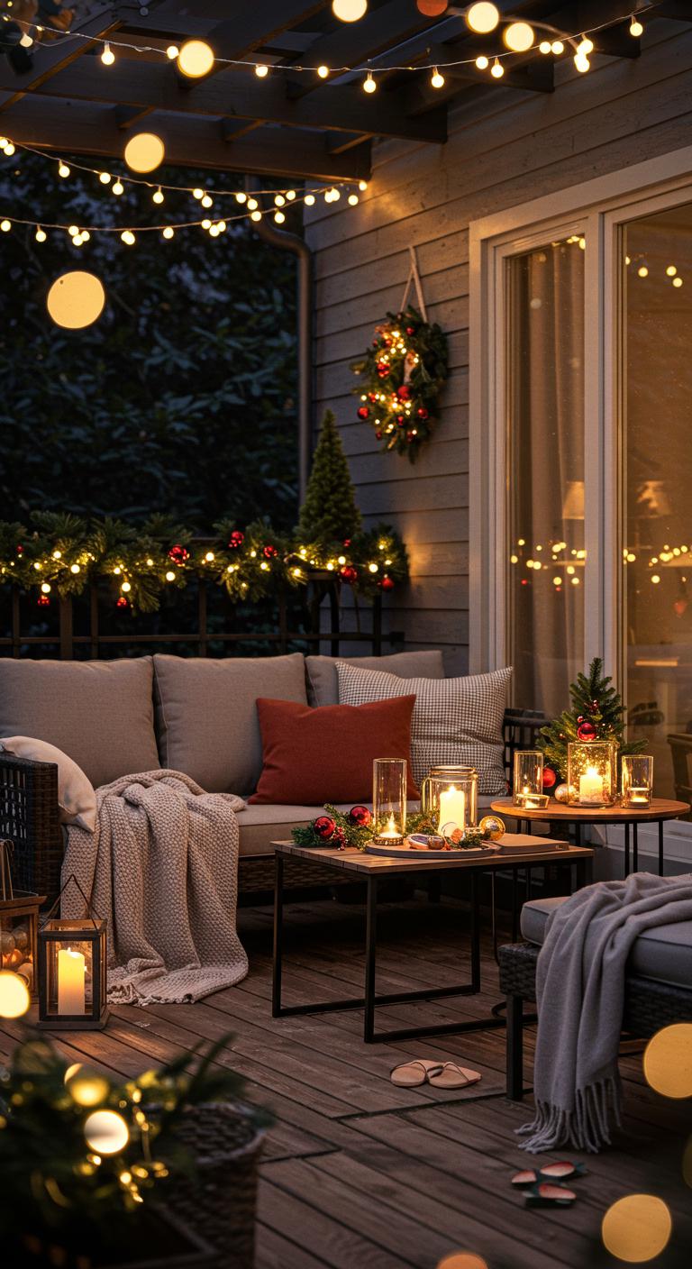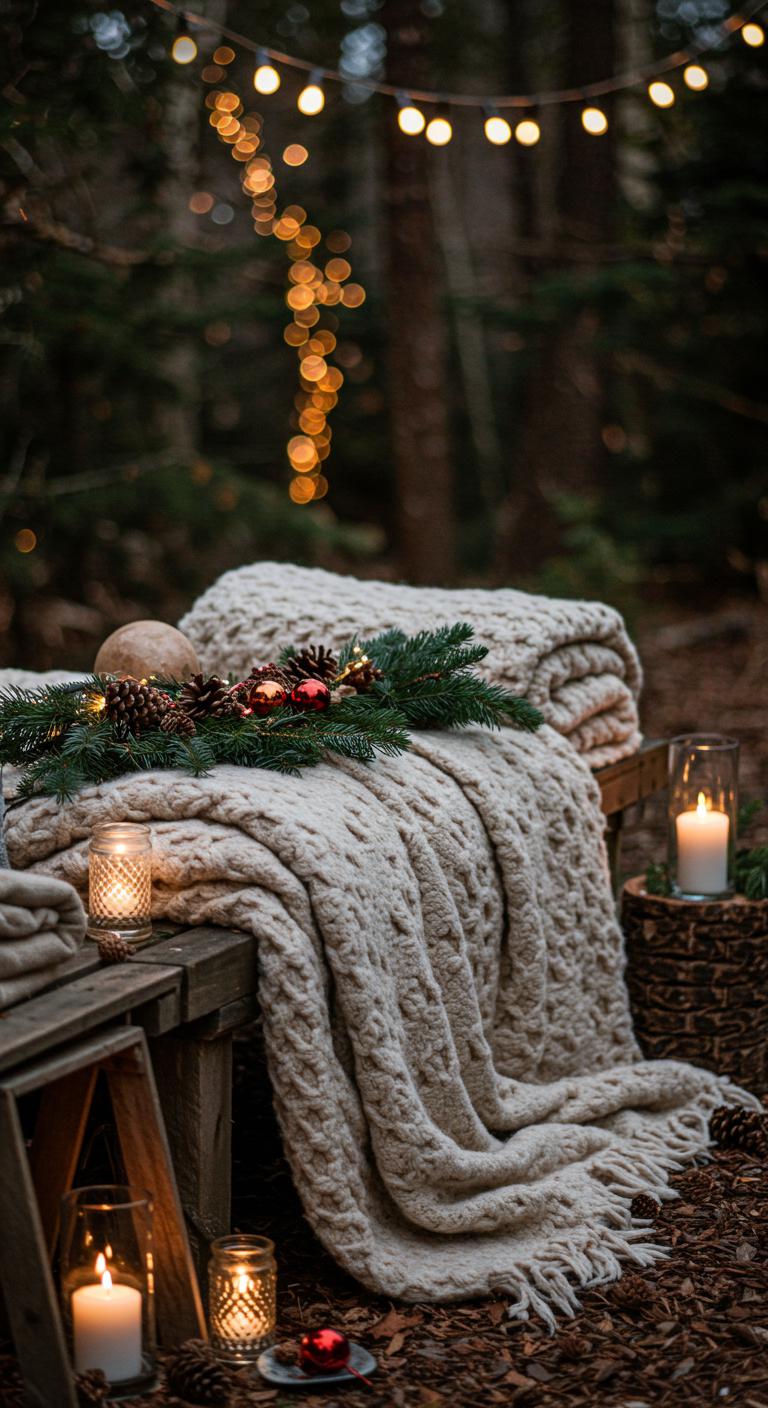Incorporating textured blankets adds warmth and comfort to outdoor seating. Choose festive patterns that match your holiday colors. You can often find affordable, cozy throws at thrift shops or clearance sales. For a festive twist, try wrapping throws around chairs or placing them over benches. This creates a cozy setting for gatherings or quiet evenings under the stars. Plus, it invites people to sit and enjoy the decorations.