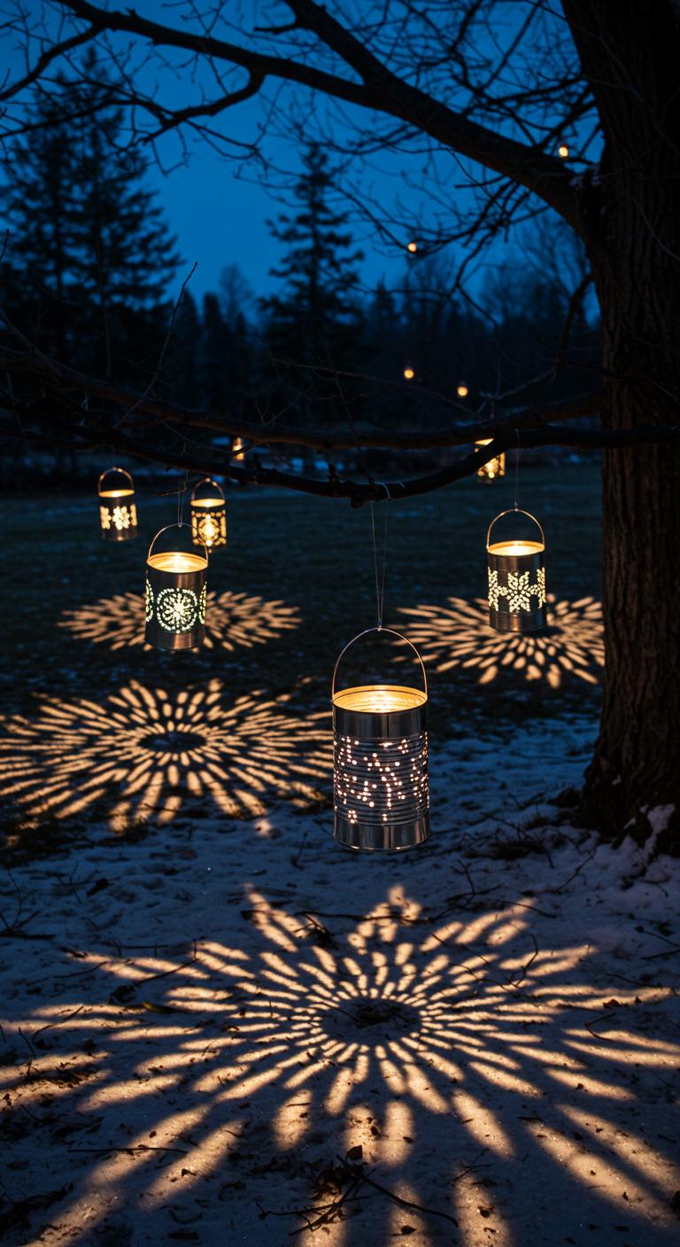 Get creative with tin can lanterns for cost-effective outdoor lighting. Simply punch holes into the side of cans to create patterns, fill them with water, and freeze them overnight. Once frozen, remove the ice and light a candle inside. The glow adds charm to any display. Hang them in trees or place along pathways. This DIY project is fun, affordable, and provides gorgeous festive lighting.