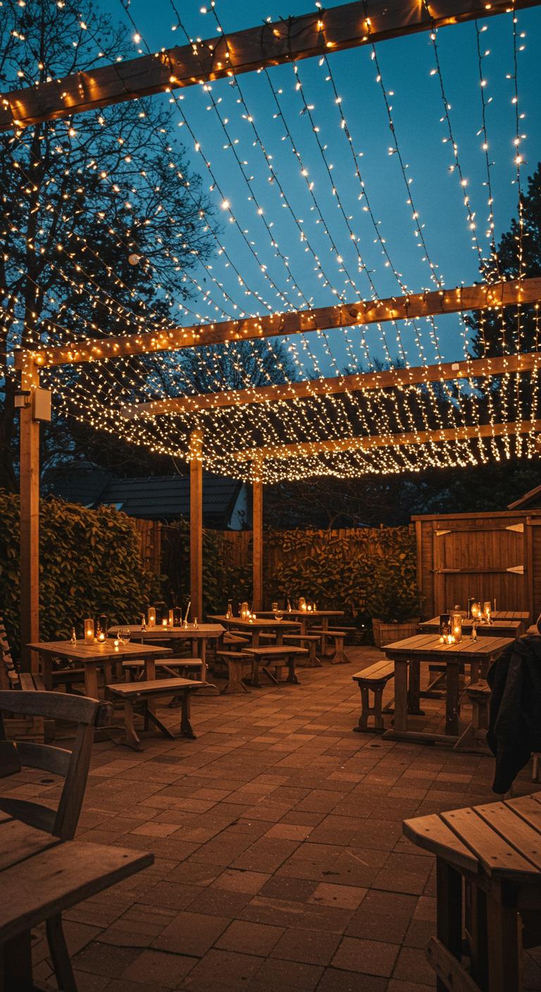 Creating a light canopy can transform a plain area into a magical outdoor space. Drape strings of lights from trees or structures overhead, creating a stunning visual display as evening falls. Use a mix of warm LED lights for coziness or colorful bulbs for playful celebrations. For DIY, simply attach lights with clips or hooks to ensure stability. This transformation sets the scene for holiday gatherings and enhances the festive mood.