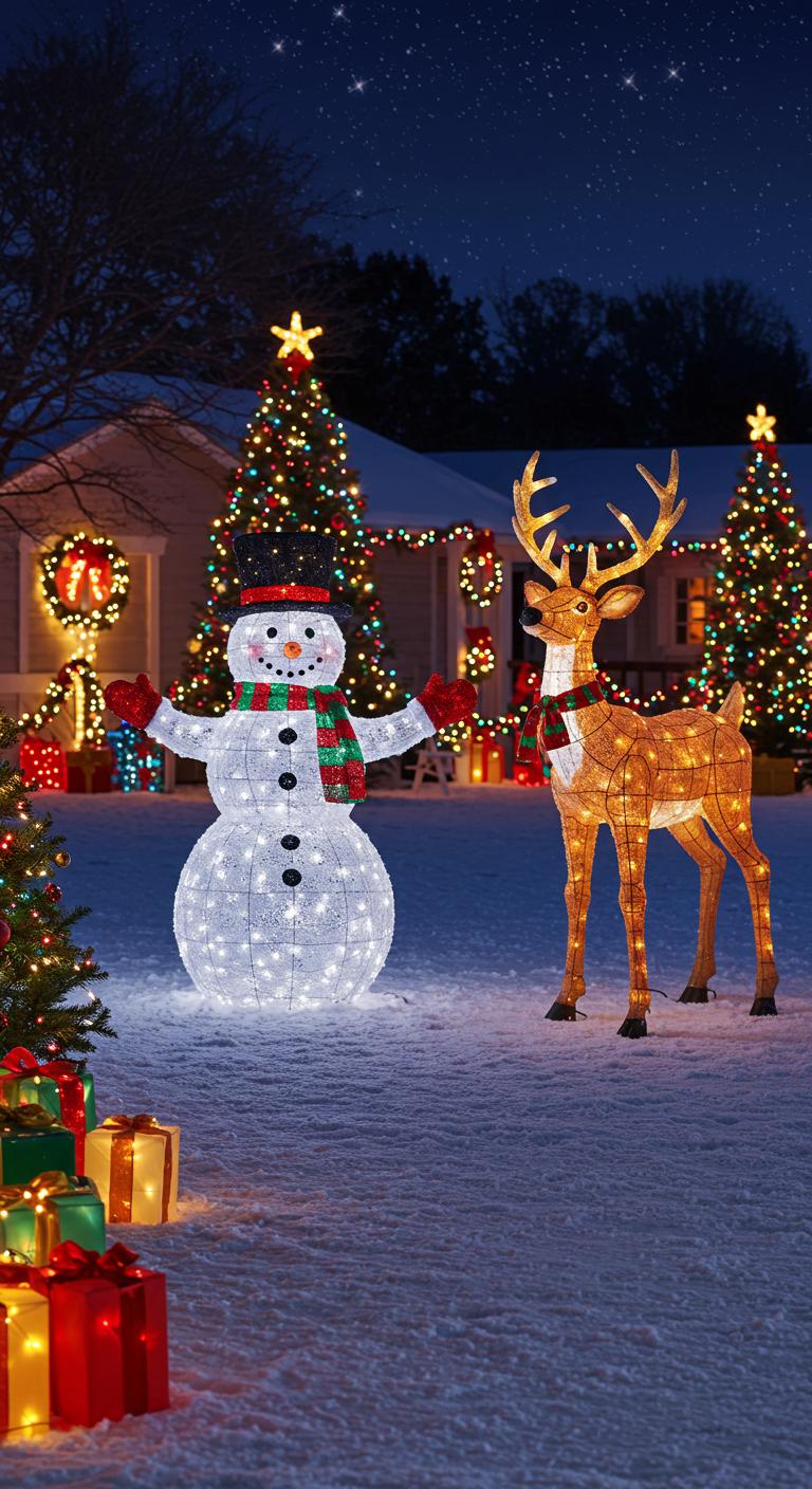 Sculptural figures add a fun and welcoming aspect to your outdoor decorations. Oversized snowmen or playful reindeer fit perfectly in spacious yards. Many stores now carry weather-resistant decorations designed to last year after year. For DIY enthusiasts, create your own figures using wood or cardboard, wrapped with lights for extra brilliance. These decorations invite a sense of joy and participation in the festivities.