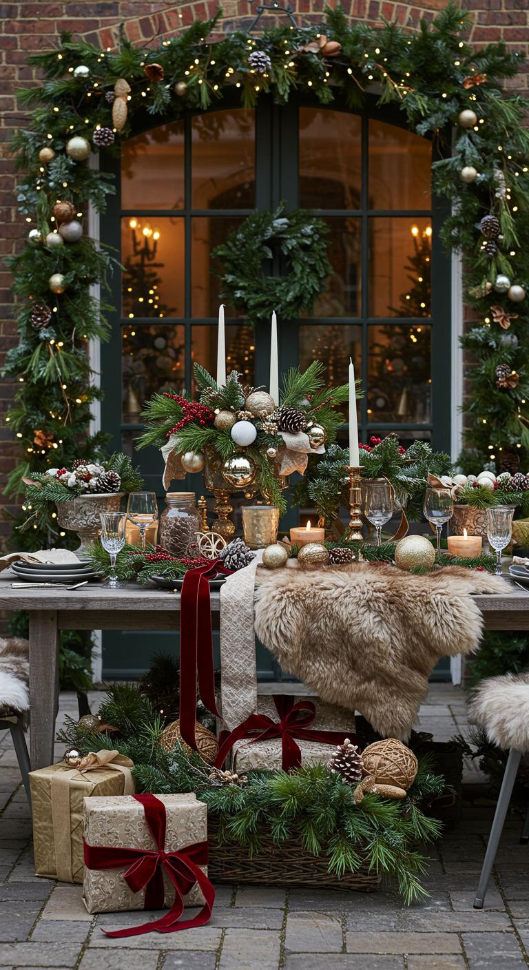 Mixing materials brings depth and a cozy feel to your outdoor decor. Combine elements like velvet ribbons, small pine boughs, and shiny ornaments. Layer these textures in wreaths, garlands, or around light displays. DIY projects can be as simple as wrapping a fur throw around a vintage bench or placing textured cushions in a cozy seating area. This approach ensures warmth and elegance, making your space welcoming.