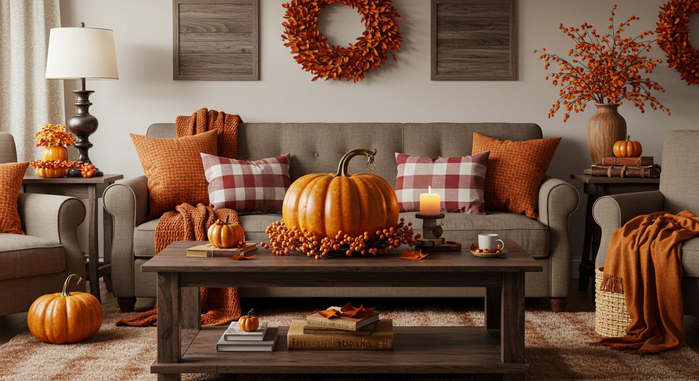 A carefully hung fall wreath, crafted from leaves and pinecones, adds a touch of elegance. Decorative pillows in rich autumn hues enhance nearby seating, inviting guests to relax.