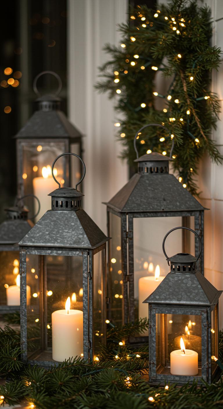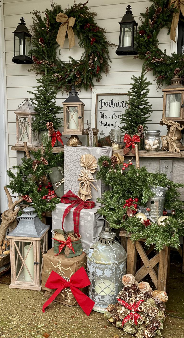 Add some personality with rustic lanterns. They create a warm glow that enhances your porch’s holiday appeal. Place oversized lanterns on either side of your entryway or hang them from hooks. Fill them with faux candles or illuminated string lights to illuminate the dark winter evenings. For a budget option, thrift shops often have unique finds at low prices. Pair them with evergreen sprigs or seasonal accents for that farmhouse charm.