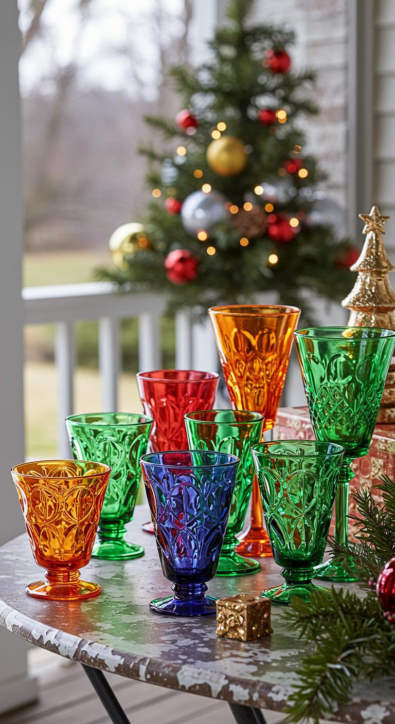 Introduce pops of color with vibrant glassware on tables or mantels. Decorative glasses, bottles, or bowls filled with festive ornaments create an eye-catching display. This adds a glamorous touch to your porch decor without overwhelming the farmhouse style. You might find unique pieces at thrift stores or yard sales, making it an affordable way to elevate your setup. Pair them with natural elements to maintain that balanced look.